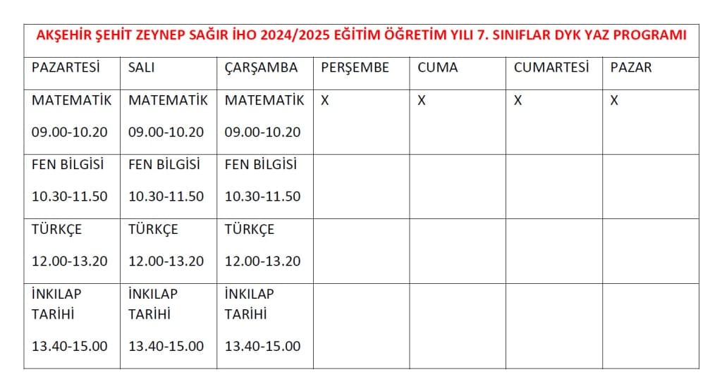7. sınıf DYK Yaz ders programımız aşağıdaki şekilde gerçekleştirilecektir.